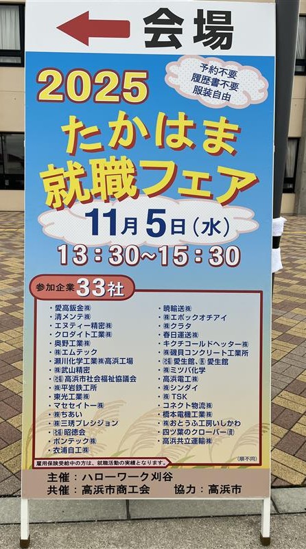 たかはま就職フェアに参加しました!! 2025-11-10 07:51:34 UTC 2025年11月5日 ハローワーク刈谷主催 たかはま就職フェアに初めて参加しました!! 2時間という短い時間ではありましたが、13名の求職者の方と直接お話させていただくことができました。 次回 2025年12月17日 刈谷市産業振興センターで開催される就職フェアに参加します!!